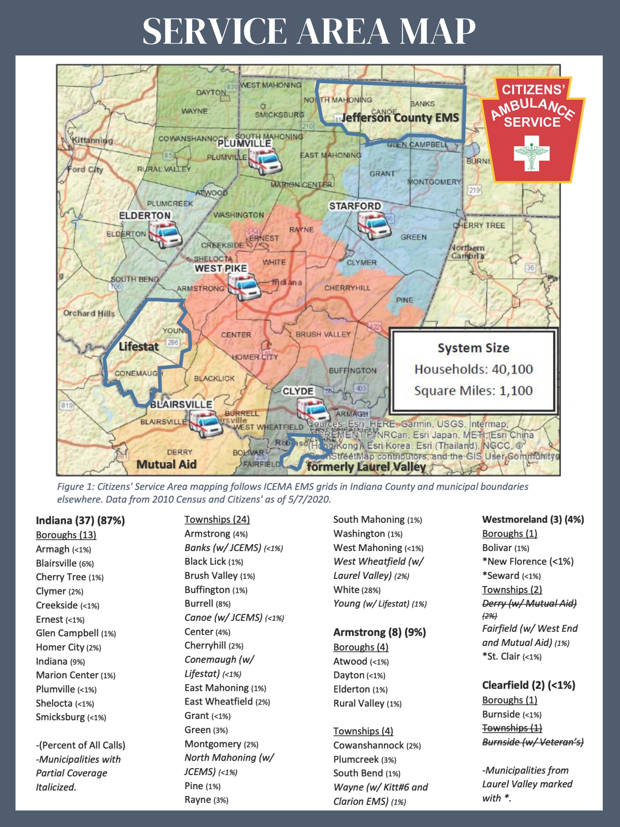 Established in 1964, Citizens’ Ambulance Service is a nonprofit corporation that provides Emergency Medical Services (EMS) and non-emergency ambulance and van service to the residents of Indiana County and portions of Armstrong, Westmoreland and Clearfield Counties. Our professional medical care staff is always on call -- just dial 911 and ask for Citizens'.